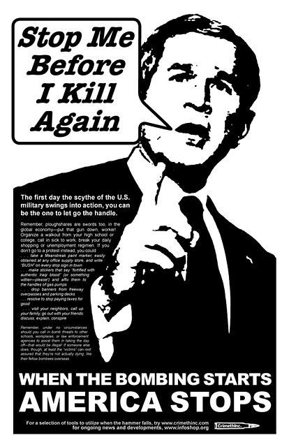 In response to George W. Bush’s assault on Iraq, demonstrators set out to shut down cities around the United States on the first day of the invasion. In San Francisco, for example, anarchists and other protesters successfully blockaded the financial district while a black bloc attacked army recruiting stations. Police responded by arresting 2200 people in that city alone.